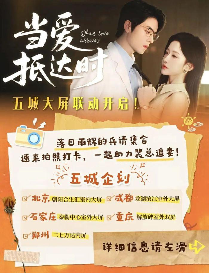 甚至“扫楼”这样只出现在内娱的专有名词也被移植到了短剧领域。今年520,何聪睿和刘念在听花岛合体扫楼,听花岛官方账号放出物料,同时为两人的三搭造势。“落日雨辉”新剧《当爱抵达时》上线前,听花岛也做了五个城市的CP大屏应援,包预热的同时包了售后。