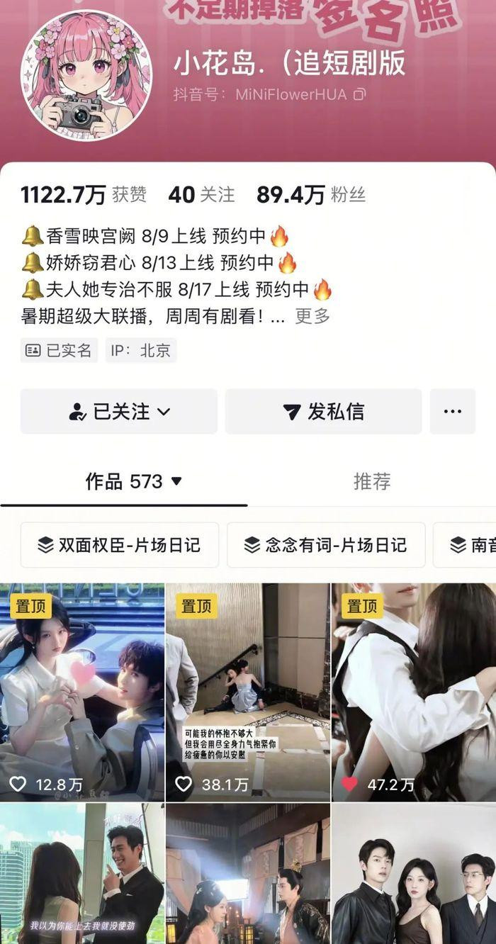 在今年的短剧CP营业中,短剧制作方的存在感变得更高了。今年2月听花岛专门开了一个“拍摄现场物料”的短视频账号,其中热度最高的视频来自于《念念有词》拍摄现场的侧拍花絮以及曾辉韩雨彤《南音再许》的现场拍摄花絮。