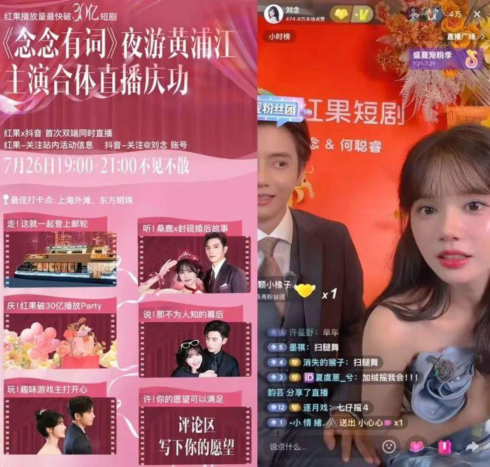 《念念有词》成为红果播放量最快破30亿短剧,为此红果还特地在黄浦江上举办了一次邮轮庆功会。庆功会上男女主刘念、何聪睿合体直播,整场直播最高观看人数在4万人。从接新娘、上游轮、喷彩带再到香槟蛋糕礼服,整场直播的流程被CP粉称作“婚庆流程”,男女主的互动也仿佛把糖喂到CP粉嘴里。
